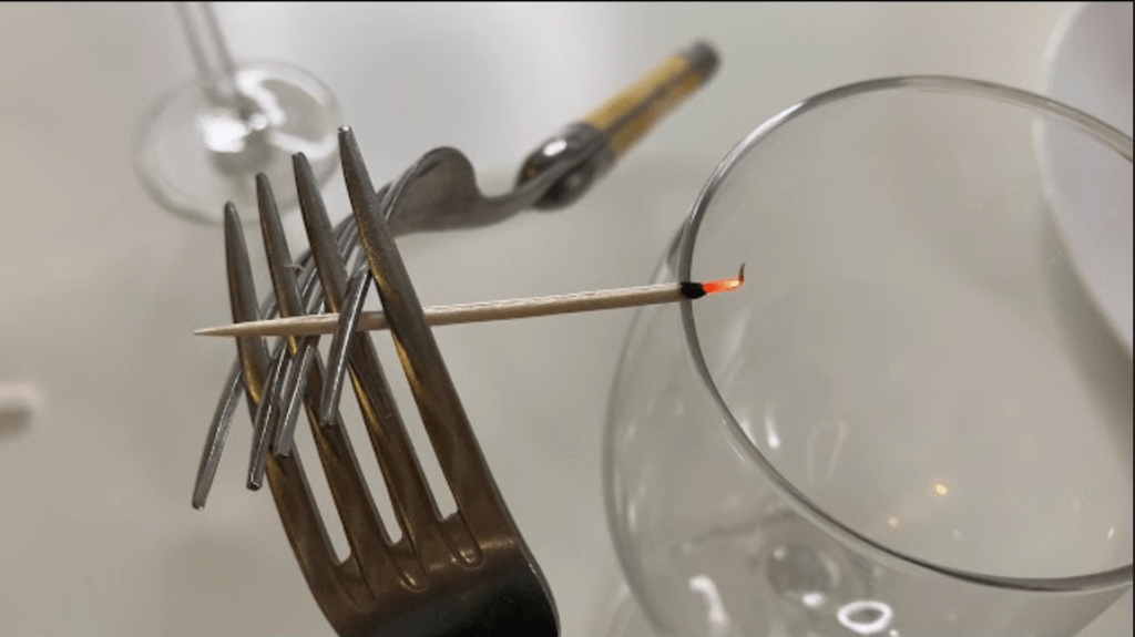 We will bring a single bent fork and a nail (or similar small pivot) to demonstrate balance. By carefully positioning the bent fork on the nail head, we can find its center of gravity and observe how it remains stable. This experiment illustrates the physics of torque, equilibrium, and center of mass in a hands-on, visual way.